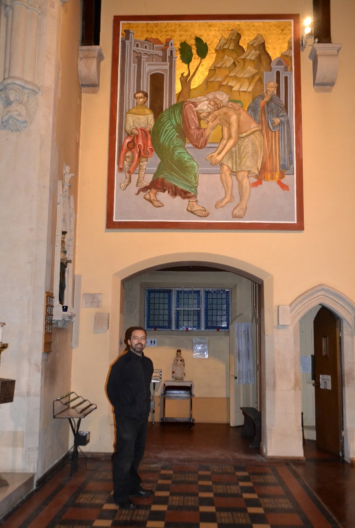 Fr Javier expressed great satisfaction with the arrival of the Merciful Father to Bow, describing the work as “a generous gift which enhances the beauty of our Church”. Contemplating the eventual location of the canvas above the confessional  he writes “…the painting speaks about the mercy of God the Father. It is telling  that the only place we could hang a 11ft by 9ft painting is over the door of the confessional. It seems that looking at this painting and reflecting  on God’s embrace of us is the step before receiving that same loving embrace of the Father through sacramental reconciliation”.
